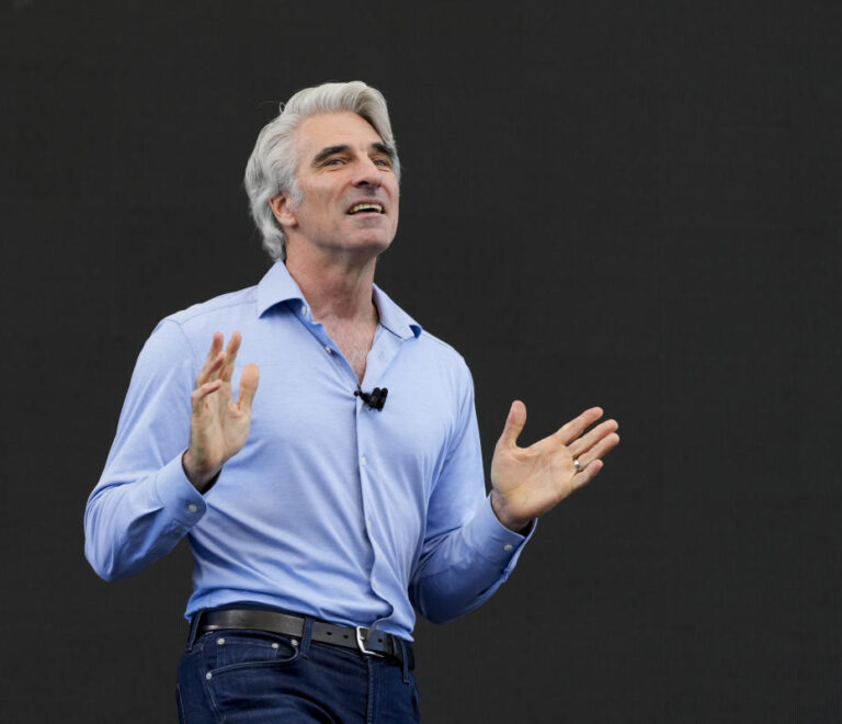 Apple software chief Craig Federighi, right, pictured with exec John Giannandrea, announced a...