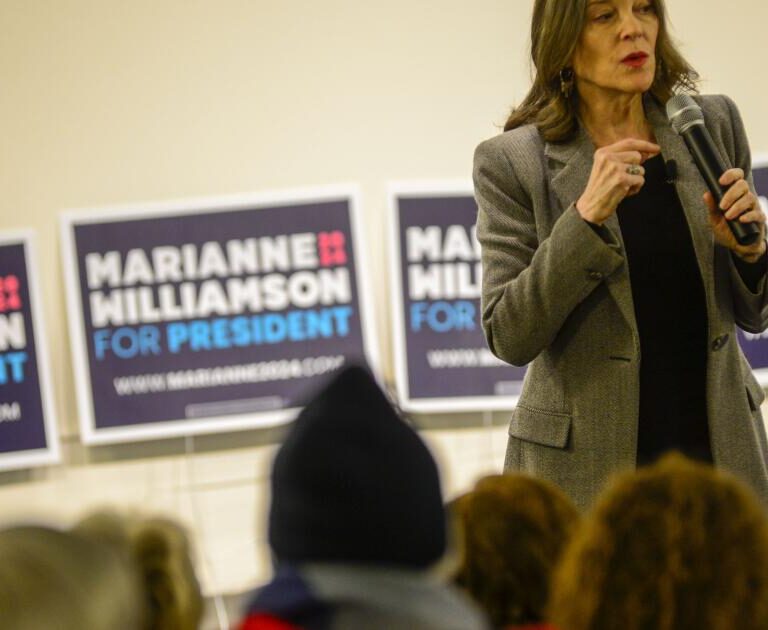 PORTSMOUTH, N.H. — Presidential long shot Marianne Williamson flitted down the aisle of a...